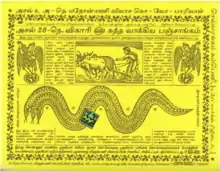 Pambu Panchangam (Tamil: பாம்பு பஞ்சாங்கம், Pāmpu Pañcāṅkam, IPA: [ˈpaːmbɨ ˌpɐn̻ʲt͡ʃaŋɡɐm]) is the name of a Tamil Calendar published by Manonmani Vilasam Press in Chennai since 1883.[1] The publisher's title for the almanac for the Tamil year 2012-2013 is Asal No. 28, Nandana Varsha Suddha Vakya Panchangam (அசல் 28—நெ. நந்தன வருஷ சுத்த வாக்கிய பஞ்சாங்கம்).[2] The almanac is popularly referred to as the Pambu Panchangam because the cover page of the almanac carries a prominent image of a snake (Tamil: பாம்பு, pāmpu). The snake referred to here is the Moon in the Panchangam. The image of the snake contains 27 small circles embedded with it. These circles represent the 27 days the Moon takes to complete one full cycle. The reason Moon is represented as a snake is that, due to the pull and push of various planets, its path is like the path left by a snake on sand.