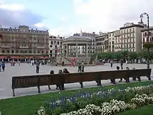 ![]() ![]() ![]() ![]() ![]() ![]() ![]() Left-right from top: Arrotxapea district; general view; Gaztelu square, cathedral of Santa María la Real; City Hall, Fueros monument; festival of San Fermín | |