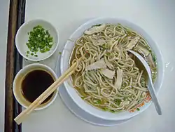The term pancit (or the standardised but less common pansít) is derived from either the Philippine Hokkien terms 扁食 (Pe̍h-ōe-jī: pán-si̍t/pián-si̍t; lit. 'wonton (noodles)') or 便的食 (Pe̍h-ōe-jī: piân-ê-si̍t/pân-si̍t; lit. 'convenient food').[5] In the Filipino language, pansít is the generic word for noodles.[6] Different kinds of noodles can be found in Filipino supermarkets which can then be cooked at home. Noodle dishes are also standard fare in local restaurants, with establishments specializing in them called panciterias or pancitans.[1]