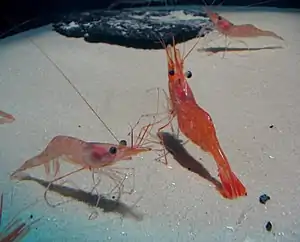 Pandalus borealis is a species of caridean shrimp found in cold parts of the northern Atlantic and northern Pacific Oceans,[1] although the latter population now often is regarded as a separate species, P. eous.[2] The Food and Agriculture Organization refers to them as the northern prawn. Other common names include pink shrimp, deepwater prawn, deep-sea prawn, Nordic shrimp, great northern prawn, northern shrimp,[1] coldwater prawn and Maine shrimp.