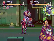 Paprium begins with three playable characters, Tug, Alex, and Dice, each with their own strength and speed, with a handful of other playable characters that the player can unlock with game progression. The game follows the three characters in Paprium, a fictional supercity built after a massive nuclear war located "somewhere at equidistant point [sic] between Shanghai, Tokyo and Pyongyang" in the year 8A2 (hexadecimal value for the year 2210).[4][5][6] The game supports both the Mega-CD and the 32X accessories, when the accessories are plugged in to a Mega Drive, it will insert boxes of the accessories in game which functions as a throw-able explosive weapon for players. In addition to this the Mega-CD's additional CPU hardware can be leveraged as a computer controlled second player in single-player games.[2]