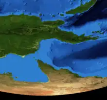 Archaeological evidence indicates that humans first arrived in Papua New Guinea around 42,000 to 45,000 years ago. They were descendants of migrants out of Africa, in one of the early waves of human migration.[26] A 2016 study at the University of Cambridge by Christopher Klein et al. suggests that it was about 50,000 years ago that these peoples reached Sahul (the supercontinent consisting of present-day Australia and New Guinea). The sea levels rose and isolated New Guinea about 10,000 years ago, but Aboriginal Australians and Papuans diverged from each other genetically earlier, about 37,000 years BP.[27] Evolutionary Geneticist Svante Pääbo found that people of New Guinea share 4%–7% of their genome with the Denisovans, indicating that the ancestors of Papuans interbred in Asia with these archaic hominins.[28]