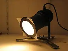 Depending on the parabolic reflector geometry, the configuration of the filament and its placement within the paraboloid, PAR lamps can achieve a wide range of beams, from narrow spot to wide flood.[3] The following suffixes are commonly used with PAR lamps to indicate their beam width:[4] PAR lamps are also manufactured to produce beam patterns specific to the needs of particular applications, such as low beam and/or high beam headlights and fog and driving lights for vehicles, and warning lamps for school buses.