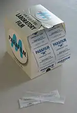 Parafilm M is commonly used in health care, pharmaceutical and research laboratories for covering or sealing vessels such as flasks, cuvettes, test tubes, beakers, petri dishes and more.[2] The "M" stands for mounting or maps, as Parafilm was originally used to mount charts and other objects using heat.[3][4] Parafilm M was marketed in 1950s for lab use and for various home applications.[3]
