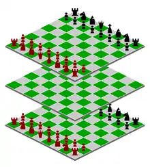 Parallel worlds chess is a three-dimensional chess variant invented by R. Wayne Schmittberger in the 1980s.[1][2][3] The gamespace comprises three 8×8 chessboards at different levels. Each side commands two full chess armies on levels 1 and 3. Level 2 begins empty and obeys its own move rules.