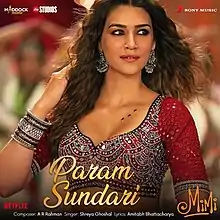 "Param Sundari" (transl. Eternal beauty) is a 2021 Indian Hindi-language song composed by A. R. Rahman for the film Mimi. Based on the Marathi film Mala Aai Vhhaychy! (2011) by Samruddhi Porey, the film was directed by Laxman Utekar and starred Kriti Sanon in the lead. The song is written by Amitabh Bhattacharya and sung by Shreya Ghoshal.[1] The song was released as the lead single along with the soundtrack album on 16 July 2021.[2] The music video for the song was released on the same day, and had viewed more than 500 million times across YouTube as on 25th January 2022.[3] The song peaked at No. 184 on the Billboard Global Excl. U.S. chart.[4]