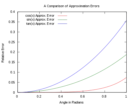 The second-order approximation is accurate within 0.5% for angles under about 10°, but its inaccuracy grows significantly for larger angles.[3]