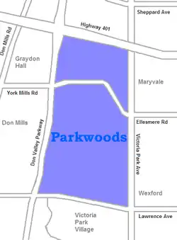 Parkwoods or sometimes referred to as Parkwoods-Donalda, is a neighbourhood in Toronto, Ontario, Canada. It is a geographically large neighbourhood located just south of Ontario Highway 401, west of Victoria Park Avenue, north of Lawrence Avenue East and east of the Don Valley Parkway.