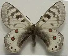 Note: The wing pattern in Parnassius species is inconsistent and the very many subspecies and forms make identification problematic and uncertain. Structural characters derived from the genitalia, wing venation, sphragis and foretibial epiphysis are more, but not entirely reliable. The description given here is a guide only. For an identification key see Ackery P.R. (1975).[1]