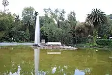 The park contains a number of other fountains, ponds, waterfalls and light posts that simulate tree trunks.[4] A large pond or small lake is inhabited by ducks and swans.[1] Many of the trees and other plants are native to humid areas of the Mediterranean such as Lebanese cypress, mimosas, and palms. There is also more exotic flora such as bamboo. Some of the existing trees were planted when the park was established.[4] The clock tower is Art Deco with ironwork and bells to mark the hour.[1] In the past, the clock tower played classical music to mark the hour.[4]
