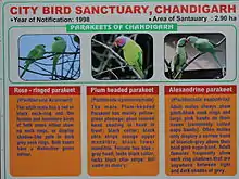 City Bird Sanctuary Chandigarh or Parrot Bird Sanctuary Chandigarh is a bird sanctuary situated in sector 21 of the city of Chandigarh, India.[1] It is primarily habitat of parrots. Hundreds of parrots live here. They fly in flocks in the morning and evening from here. There are two parks adjoining to this sanctuary. Flocks of parrots sit on the trees of these parks also. It is the second wildlife sanctuary of Chandigarh. Sukhna wildlife sanctuary near Sukhna Lake is another wildlife sanctuary of the city. It is notified under Section 18 of the Wildlife (Protection) Act, 1972.