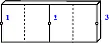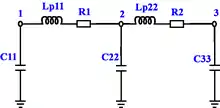 where is an incident electric field, is a current density, is the magnetic vector potential, is the scalar electric potential, and the electrical conductivity all at observation point . In the figures on the right, an orthogonal metal strip with 3 nodes and 2 cells, and the corresponding PEEC circuit are shown.