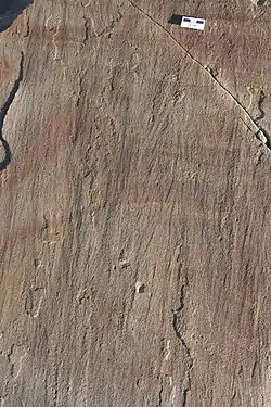 Parting lineation (also known as current lineation or primary current lineation) is a subtle sedimentary structure in which sand grains are aligned in parallel lines or grooves on the surface of a body of sand (or lithified as a sandstone).[1] The orientation of the lineation is used as a paleocurrent indicator, although the precise flow direction (i.e. upstream vs. downstream) is often indeterminable. They are also the primary indicator of the lower part of the upper flow regime bedform.
