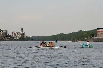 The river flows northeast into the city of Paterson, where it drops over the Great Falls of the Passaic. On the north end of Paterson, it turns abruptly south, flowing between Paterson and Clifton on the west and Hawthorne, Fair Lawn, Elmwood Park, Garfield on the east, next through the city of Clifton. At Elmwood Park it begins to form Dundee Lake, created by the Dundee Dam built in 1845. The river becomes navigable two point five miles (four point zero kilometres) downstream of the Dundee Dam at the Eighth Street/Locust Ave Bridge in Wallington where the dredged Wallington Reach channel begins.[3] Proceeding beyond the Wallington Reach, the river remains navigable via a series of maintained channels to its final destination, Newark Bay. It passes Passaic, Clifton again, then Nutley and Belleville on the west; it flows past Rutherford, Lyndhurst, and North Arlington to the east.