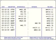 Withdrawals normally required the account holder to visit the branch where the account was held, where a debit slip or withdrawal slip would be prepared and signed. If the teller did not know the account holder, the signature on the slip and the authorities would be checked against the signature card at the branch, before money was paid out. In the 1980s, banks adopted the black light signature system for passbooks, which enabled withdrawals to be made from passbooks at a branch other than the one where an account was opened, unless prior arrangements were made to transfer the signature card to the other branch. Under this system, the passbook's owner would sign in the back of the passbook in an invisible ink and the signing authorities would also be noted. At the paying branch, the signature on the withdrawal slip would be checked against the signature in the book, which required a special ultraviolet reader to read.[2] Today, the customer is more commonly verified by PIN and commonly through an automated teller machine.