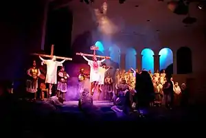 The Passion of the Christ is performed every year during Easter, in a purpose-built 100,000-square-metre (1,100,000 sq ft) theatre-city in the arid backlands of Pernambuco, in northeastern Brazil. It is considered to be the largest open-air theatre in the world.[16] Thousands of visitors arrive every year to watch the performance; over 500 actors appear on the nine separate stages within the stone walls of the New Jerusalem city-theatre, founded in 1968.[17][18] 2.2 miles of walls and 70 towers flank the outer perimeter of the New Jerusalem Theater. The first passion play in the town took place in 1951, and consisted only of a few family and friends playing all of the roles. In 1963, the townspeople began constructing a replica Jerusalem in Brejo da Madre de Deus.[19] The nine separate stages include The Upper Room, the Roman Forum, Herod's palace, Bethesda Lake and the Sepulcher. During 8 performances during the Holy Week, an average of 8,000 people per show from around the globe follow the actors as they move through “ancient Jerusalem,” portraying every step of the Passion of Christ.[20][21] In the 2010 season, when the 43rd anniversary of the Passion of Christ in Nova Jerusalem was celebrated, the public reached a record 80,000 people, coming from 22 Brazilian states and 12 countries.[22][23]
