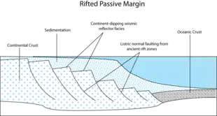 The main features of passive margins lie underneath the external characters. Beneath passive margins the transition between the continental and oceanic crust is a broad transition known as transitional crust. The subsided continental crust is marked by normal faults that dip seaward. The faulted crust transitions into oceanic crust and may be deeply buried due to thermal subsidence and the mass of sediment that collects above it. The lithosphere beneath passive margins is known as transitional lithosphere. The lithosphere thins seaward as it transitions seaward to oceanic crust. Different kinds of transitional crust form, depending on how fast rifting occurs and how hot the underlying mantle was at the time of rifting. Volcanic passive margins represent one endmember transitional crust type, the other endmember (amagmatic) type is the rifted passive margin. Volcanic passive margins also are marked by numerous dykes and igneous intrusions within the subsided continental crust. There are typically a lot of dykes formed perpendicular to the seaward-dipping lava flows and sills. Igneous intrusions within the crust cause lava flows along the top of the subsided continental crust and form seaward-dipping reflectors.