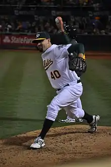 On September 22, Neshek gave up the game-tying home run in the bottom of the 13th inning to New York Yankees slugger Raúl Ibañez. The A's had scored four runs in the top of the inning, leading to a galling 10–9 loss the next inning.[32] However, the A's defeated the Yankees the next day and went 9–2 to end the season, edging the Texas Rangers out of the American League West championship by one game, including sweeping the final three-game series in Oakland.[33] In 24 games with the A's, Neshek went 2–1 in 19+2⁄3 innings, yielding 10 hits and six walks, along with 16 strikeouts and a 1.37 ERA. He relied heavily on the slider, throwing it 83.5 percent of all pitches.[34]