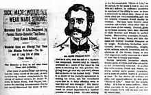 Another publicity method – undertaken mostly by smaller firms – was the medicine show, a traveling circus of sorts that offered vaudeville-style entertainments on a small scale, and climaxed in a pitch for some sort of cure-all nostrum. "Muscle man" acts were especially popular on these tours, for this enabled the salesman to tout the physical vigour the product supposedly offered. The showmen frequently employed shills, who stepped forward from the crowd to offer "unsolicited" testimonials about the benefits of the medicine.[14] Often, the nostrum was manufactured and bottled in the wagon in which the show travelled. The Kickapoo Indian Medicine Company became one of the largest and most successful medicine show operators. Their shows had an American Indian or Wild West theme, and employed many American Indians as spokespeople such as the Modoc War scout Donald McKay.[15] The "medicine show" lived on in American folklore and Western movies long after they vanished from public life.