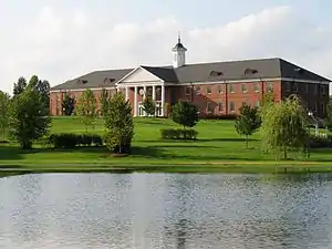 Patrick Henry College is located in the town of Purcellville in rural northern Virginia, approximately 40 miles (64 km) northwest of Washington, D.C. The campus currently consists of seven buildings arranged around a retention pond popularly called "Lake Bob",[20] as well as several athletic fields. The oldest structure, Founders Hall, opened in 2000 and contains three classrooms, the college library, and various administrative and faculty offices. It is also home to the offices of the Home School Legal Defense Association.[21] Hanna Rosin, author of God's Harvard, described the campus as "tiny, less like an Ivy League college than like a Hollywood set of an old Ivy League school." The buildings are of Colonial Revival architecture. The artwork in Founders Hall consists of copies of portraits of the Founding Fathers placed along a staircase, leading to a picture of Patrick Henry at the second Virginia convention which features a light from heaven guiding Henry's speech. The artwork is designed to, in the words of Hanna Rosin, "remind the students that America was founded as a Christian nation."[22]