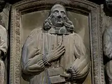 Bishop Scougall was interred in St. Machar's Cathedral in Old Aberdeen. His monument, a large 3-dimensional tomb in the south-west corner of the nave, is a notable example of 17th century Scottish neo-classical design, including a 'portrait' of Scougal (see above), and a rich array of symbolic ornament, including Scougal and his wife naked, united ny "king death".