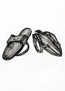 The word could also be used as a term for a wooden soled shoe, that is a chopine or clog, as opposed to an overshoe, until at least the nineteenth century. The word was also used for the traditional wooden outdoor shoes of Japan and other Asian countries.[9] What are in effect snowshoes for mud, as used by wildfowlers, boatmen, and Coast Guards may also be called pattens, or "mud-pattens". These are shaped boards attached to the sole of a shoe, which extend sideways well beyond the shape of the foot, and therefore are a different sort of footwear from the patten discussed here. "Horse-pattens" were used on horses, especially for ploughing muddy fields. The word was also used for ice-skates, as it is in French (patiner, to skate).