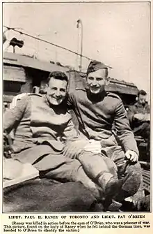 A photo of Raney and O'Brien was found on Raney's body, and given to O'Brien by the Germans. When Raney did not return from his patrol, a letter was dispatched two days later to his family in Canada, stating that he had gone missing. A very short note was later dropped over the British lines by the Germans, addressed from Patrick O'Brien to his commanding officer, stating simply "Paul Raney killed." This information was taken as official soon after O'Brien escaped from Courtnai prison in Belgium, and returned to Canada. O'Brien visited Raney's parents in Toronto to inform them of what he knew, and to bring them a map of his grave. He preserved this map through a difficult escape which included swimming through canals. This map is no longer extant. Regardless of its ultimate fate, ground fighting (and shelling) over the same territory in 1918 would have rendered nearly any map or grave marker largely useless. Subsequent attempts by the War Graves Commission (after repeated appeals by his father to them) failed to locate any trace of Raney's remains or final resting place. Raney's ultimate resting place near Roeselare, Belgium, wherever it is, remains unknown.