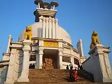 The Rajgir Vishwa Shanti Stupa/World Peace Pagoda (25.004553°N 85.444539°E) was completed in 1969 at Rajgir hills near Rajgir, near the Vulture's Peak where the Buddha is believed to have preached the Lotus Sutra.[3] The dedication coincided with the 100th anniversary of the birth of Mahatma Gandhi. The site also includes a Nipponzan Myohoji temple.[4]