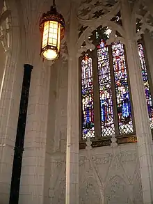 The Peace Tower was designed by architect John A. Pearson not only to stand as an architectural feature and landmark, but also to function as a memorial to Canadians who had given their lives during the Great War.[5] It thus houses the Memorial Chamber, a vaulted 7.3 m by 7.3 m (24 ft by 24 ft) room directly above the porte-cochere,[1] with stained glass windows and various other features illustrating Canada's war record, such as the brass plates made from spent shell casings found on battlefields that were inlaid into the floor, and bore the name of each of Canada's major conflicts during the First World War. Stone that architect John Pearson personally collected from the main European battlefields where Canadians were killed is included in the floors and walls. Pearson described the room, also called the Memorial Chapel, as a "sacred grove in the middle of the forest."[6]