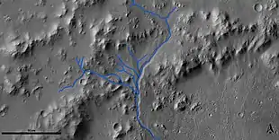 Compared with most terrestrial valleys carved by rainfall, the drainage density (stream length per unit area) of Peace Vallis and its tributaries is very low. There is a lack of highly integrated fluvial channels,[17] and the areas between the tributary valleys (interfluves) are undissected by smaller valleys or gullies. The drainage density of the Peace Vallis system has been estimated to be 0.15 km–1.[16] In contrast, drainage densities of rivers on Earth range from 2 to 30 km–1.[18] Factors that control drainage density include slope, rock type (which determines infiltration capacity)[19] and climate (mainly precipitation). The low drainage density of Peace Vallis suggests an environment of relatively gentle slopes, very low (or infrequent) precipitation, permeable soils or bedrock, or some combination of the three.[20]