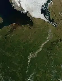 The Pechora is 1,809 kilometres (1,124 mi) long (a little shorter than the Columbia River) and its basin is 322,000 square kilometres (124,000 sq mi), or about the same size as Finland. By mean annual discharge it ranks third in Europe, after the Volga and Danube.[3] Its discharge is about half that of the Danube and a little more than its sister, the Northern Dvina, and is the largest of any river with no dams in its basin outside of New Guinea.[3]