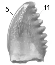 The holotype, UCM 38445, consists of a 6.2 mm long adult tooth. The paratypes are three juvenile teeth.[1]