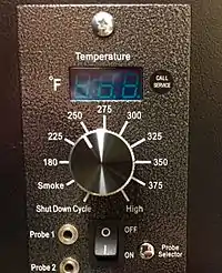 First, the desired temperature is programmed into the electronic control panel. A motor-driven auger then feeds a small amount of pellets from the hopper to the fire pot. Igniter rods light the pellets and prime the fire, raising the grill to an initial starting temperature of 140 °F (60 °C) to 180 °F (82 °C), depending on the manufacturer. Once the fire is ready, the desired temperature is achieved via a repeated duty cycle, which represents a segment of time when the auger is active and idle. A single duty cycle starts when the auger turns on and begins feeding pellets then continues through the period when it shuts off and remains idle. The duty cycle ends when the auger turns on again. For example, a pellet grill set to 250 °F (121 °C) might have an auger-on period of 10 seconds followed by an auger-off period of 50 seconds. Duty cycles are typically stated as a percentage that represents the amount of time the auger is running—an auger that's always on has a 100% duty cycle, while one that is on half the time has a 50% duty cycle.[12] Each temperature setting has a different duty cycle. However, regardless of that temperature setting, the auger-on portion of the duty cycle remains constant. The auger-off period is the variable. Lower temperatures have longer auger-off periods, while high temperatures have shorter.