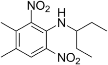 Pendimethalin is an herbicide of the dinitroaniline class[2] used in premergence and postemergence applications to control annual grasses and certain broadleaf weeds. It inhibits cell division and cell elongation. Pendimethalin is listed in the K1-group according to the Herbicide Resistance Action Committee (HRAC) classification and is approved in Europe, North America, South America, Africa, Asia and Oceania for different crops including cereals (wheat, barley, rye, triticale), corn, soybeans, rice, potato, legumes, fruits, vegetables, nuts as well as lawns and ornamental plants.
