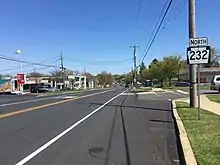 After this intersection, the road narrows back to two lanes and turns northeast into residential areas, reaching a junction with Maple Avenue.[4] PA 232 makes a curve to the north as it crosses Bristol Road into Northampton Township.[7] The route turns northeast again and continues past more housing developments with a few businesses.[4] At Richboro, the road crosses Ironworks Creek and passes shopping centers and businesses as Bustleton Pike merges into Second Street Pike and PA 232 continues due north. The route widens to four lanes and passes more commercial development as it crosses PA 332 (Almshouse Road/Newtown Richboro Road).[4][7] Following the PA 332 junction, the road narrows to two lanes and passes more residential areas, with Worthington Mill Road branching to the northeast.[4] As the route approaches the Sacketts Ford Road intersection, the settings become more rural as the road passes near farms and woods with some homes.[4][7]