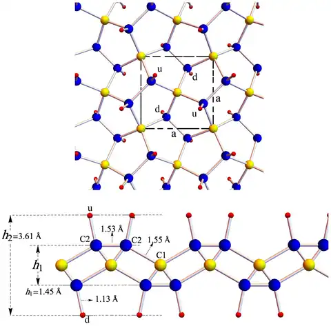![]() Top view (top) and side view (bottom) of penta-graphane. Yellow and blue spheres show two types of carbon atoms, while red balls correspond to hydrogens.[1] | |