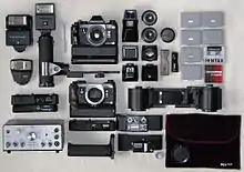 The Pentax LX is a 35 mm single-lens reflex camera produced by Pentax in Japan. It was introduced in 1980 to commemorate the 60th anniversary of Asahi Optical Co., and was produced until 2001.[2] The LX uses the K mount, which is the Pentax proprietary bayonet lens mount, and has manual and aperture priority automatic exposure modes. It is the top-of-the-line professional, or "system", camera in the Pentax manual focus range, and has a large body of accessories. Compared with contemporary professional camera bodies from rival manufacturers, like the Canon New F-1 or Nikon F3, the LX body is smaller and lighter, weighing in at 570 grams (1.26 pounds) with its standard FA-1 finder.[3][4]