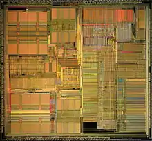 The Pentium OverDrive is a heavily modified, 3.3 volt Pentium P54 core manufactured on 0.6 micrometer technology. It is fitted with a 486-compatible bus unit (though with an increased pin-count), an integrated heatsink and fan, and 32 kB of level 1 cache, double the 16 kB offered on regular P54C chips.[1] As the data bus was effectively reduced to 32-bit width, per-clock performance was much lower than that of a 'regular' Pentium, though still substantially faster compared to a similarly clocked 486 owing to the Pentium's architectural improvements, such as the much improved FPU. It was also equipped with an integrated 3.3 volt power regulator as many 486 motherboards only provided 5 volt power.
