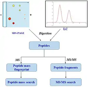 The advantage of this method is that only the masses of the peptides have to be known. A disadvantage is that the protein sequence has to be present in the database of interest. Additionally most PMF algorithms assume that the peptides come from a single protein.[7] The presence of a mixture can significantly complicate the analysis and potentially compromise the results. Typical for the PMF-based protein identification is the requirement for an isolated protein. Mixtures exceeding a number of 2–3 proteins typically require the additional use of MS/MS-based protein identification to achieve sufficient specificity of identification. Therefore, typical PMF samples are isolated proteins from two-dimensional gel electrophoresis (2D gels) or isolated SDS-PAGE bands. Additional analyses by MS/MS can either be direct, e.g., MALDI-TOF/TOF analysis or downstream nanoLC-ESI-MS/MS analysis of gel spot eluates.[7][8]