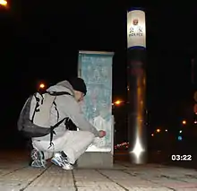 In the Quantum Police project, the above-mentioned problematic is taken even further. Here, the artist mixes (stolen or found?) police evidence material with interviews and fictional texts that describe elaborate conspiracy theories involving the police both in Europe and China.[10] Delving deeper into questions of authenticity, the artist has also staged events that cross the boundaries of academic presentations, guided tours, and performance art. These have taken place at institutions like MACRO in Rome, CAPC in Bordeaux, Rockbund Art Museum in Shanghai, Tate Britain and Hayward Gallery[10] in London and as part of experimental projects like The Invisible Generation[56] and the international research group OuUnPo.[57] Contrary to the video work, where the sound is subdued, Hüttner often uses music in the recent performances and installations in order to purposefully create paradoxical and misleading timelines.[58] These investigations into time, duration and the impermanent nature of knowledge have further been developed in an ongoing collaborative research with the Turkish writer/curator Fatos Üstek that started like a creative writing exchange in the Anglo-Austrian magazine Nowiswere[59][60][61] and that has led to interventions in museums like the Wacoal Art Center in Tokyo and Tate Modern in London[62] as well as in public spaces in New York City, Philadelphia, Porto,[57] Yokohama and Athens.[10]