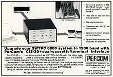 Percom Data Corporation was an early microcomputer company formed in 1976 to sell peripherals into the emerging microcomputer market. They are best known for their floppy disk systems, first for S-100 machines, and the later for other platforms like the TRS-80 and the Atari 8-bit family.[2] The company was purchased by Esprit Systems in 1984.