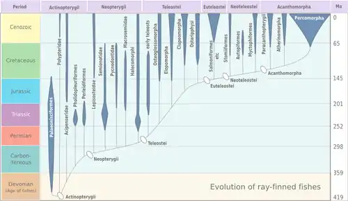 Percomorpha are the most diverse group of teleost fish today. Teleosts, and percomorphs in particular, thrived during the Cenozoic era. Fossil evidence shows that there was a major increase in size and abundance of teleosts immediately after the mass extinction event at the Cretaceous-Paleogene boundary ca. 65 Ma ago.[6]