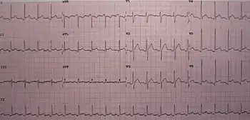 | An ECG showing pericarditis, with ST elevation in multiple leads and slight reciprocal ST depression in aVR. | |