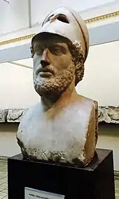 ![]() Bust of Pericles bearing the inscription "Pericles, son of Xanthippus, Athenian". Marble, Roman copy after a Greek original from c. 430 BC, Museo Pio-Clementino, Vatican Museums, | |