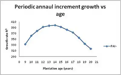 In forestry, periodic annual increment (PAI) is the change in the size of a tree between the beginning and ending of a growth period, divided by the number of years that was designated as the growing period.[1] For sigmoid growth, the graph of PAI increases rapidly and then quickly declines, approaching zero. PAI may go negative if a tree loses volume due to damage or disease. Periodic annual increment is commonly used instead of current annual increment as a basis for computing growth per cent. Growth per cent indicates the rate of increase with relation to the wood capital required for its production, this is usually based on a single year's growth.[2]