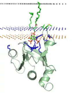 The reversible attachment of proteins to biological membranes has shown to regulate cell signaling and many other important cellular events, through a variety of mechanisms.[2] For example, the close association between many enzymes and biological membranes may bring them into close proximity with their lipid substrate(s).[3] Membrane binding may also promote rearrangement, dissociation, or conformational changes within many protein structural domains, resulting in an activation of their biological activity.[4][5] Additionally, the positioning of many proteins are localized to either the inner or outer surfaces or leaflets of their resident membrane.[6] This facilitates the assembly of multi-protein complexes by increasing the probability of any appropriate protein–protein interactions.