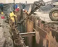 Sheet pile and excavation were used for the installation of earlier PRBs. This method involves containing the area of excavation using sheet piles before excavating using a trackhoe. This method may be slow (and therefore expensive) and is only viable for plumes less than 35 feet deep.[13]