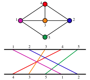 In the mathematical field of graph theory, a permutation graph is a graph whose vertices represent the elements of a permutation, and whose edges represent pairs of elements that are reversed by the permutation. Permutation graphs may also be defined geometrically, as the intersection graphs of line segments whose endpoints lie on two parallel lines. Different permutations may give rise to the same permutation graph; a given graph has a unique representation (up to permutation symmetry) if it is prime with respect to the modular decomposition.[1]