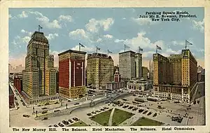 Shortly after the opening of the Park Avenue Viaduct in 1919, the area at the bottom of the viaduct was renamed for Pershing.[4] The former Grand Union Hotel space was proposed for use as an open plaza[5] with a three-story memorial called "Victory Hall".[6] The idea of a victory hall was opposed by Fiorello H. La Guardia, president of the New York City Board of Aldermen.[7] The Transit Commission attempted to sell the building site in May 1920 for $2.8 million (equal to $29 million in 2021),[8] but no one placed a bid.[9][10]