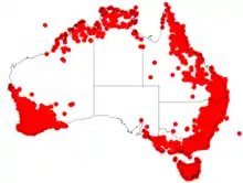 All species are endemic to Australia, though a closely related species, Toronia toru is found in New Zealand and has been described as a species within the genus Persoonia previously. They are widespread in non-arid regions. One species, P. pertinax, is found only in the Great Victoria Desert, while a few other species venture into the arid zone, but most are concentrated in the subtropical to temperate parts of south eastern and south western Australia, including Tasmania.